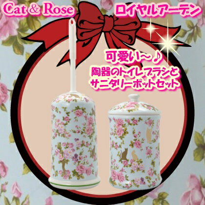 猫ちゃんグッズ 素敵なギフトBox入り 薔薇 ロイヤルアーデン ローズ柄とかわいいネコ 陶器のトイレ洗浄ブラシ&サニタリーポットセット掃除用具セット トイレ用品 インテリア雑貨 生活用品 可愛い姫系バラ雑貨